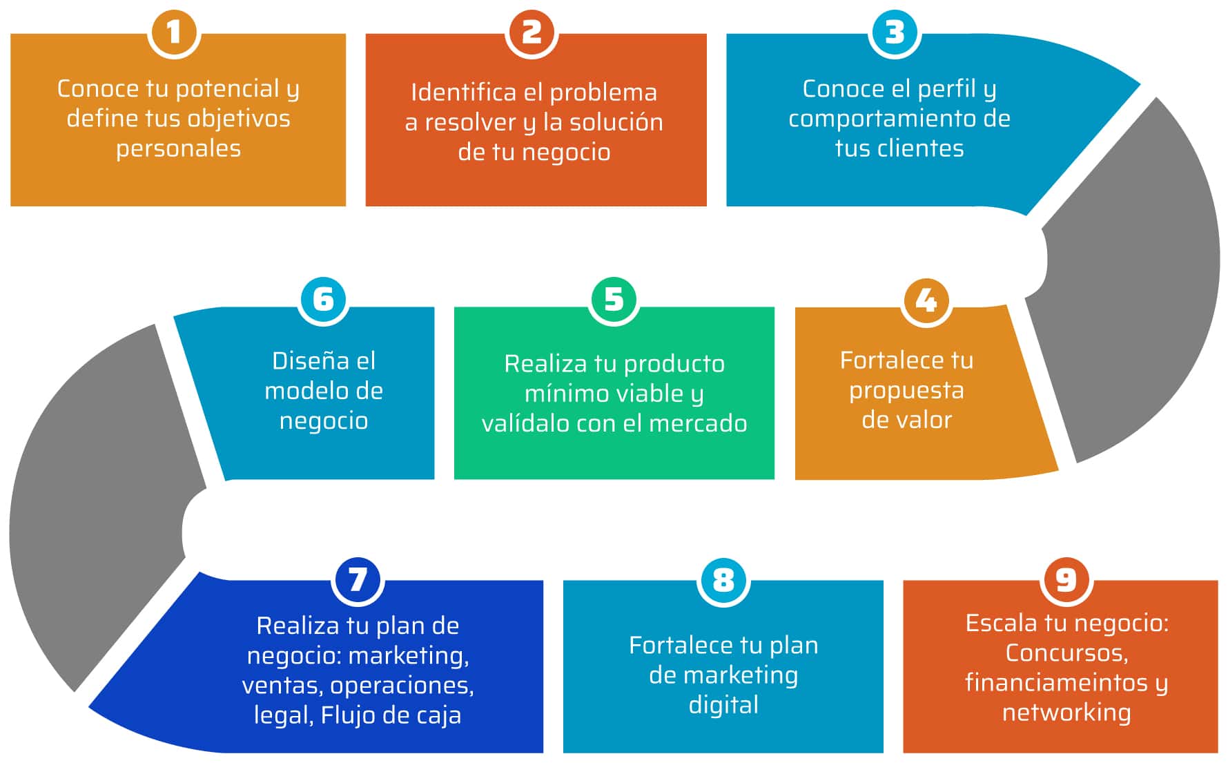 Frente a esta necesidad, Conquista Lab te brinda 9 pasos firmes para reducir la incertidumbre y el riesgo, y poder, así, convertir tu idea en realidad. Aquí te presentamos nuestra metodología: