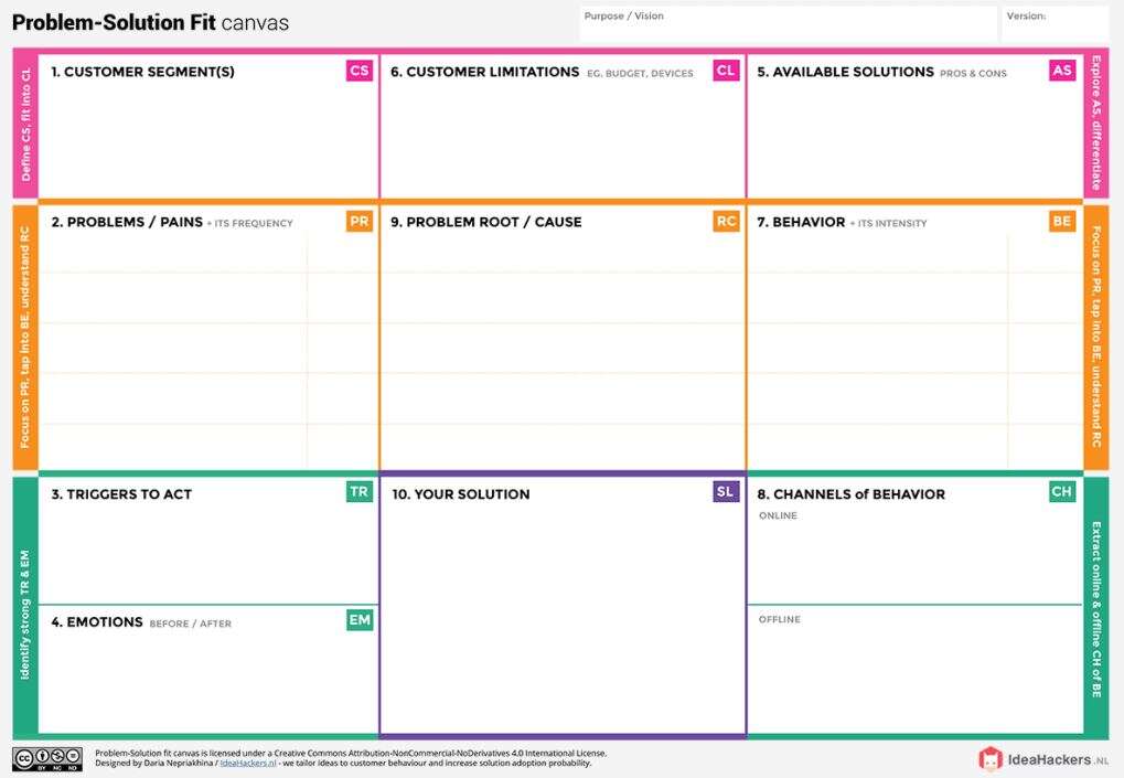 El ajuste Problema-Solución ayuda a los emprendedores a identificar comportamientos y validar hipótesis con el fin de reconocer si nuestra idea funcionaría o no. Este lienzo nos ayuda a identificar las soluciones que tenemos en mente y así solventar el problema que queremos resolver con nuestro producto o servicio. Esta herramienta se basa en ayudar a los emprendedores a que puedan traducir un problema en una solución de una manera sencilla, teniendo presente el comportamiento del cliente y el contexto que lo rodea.