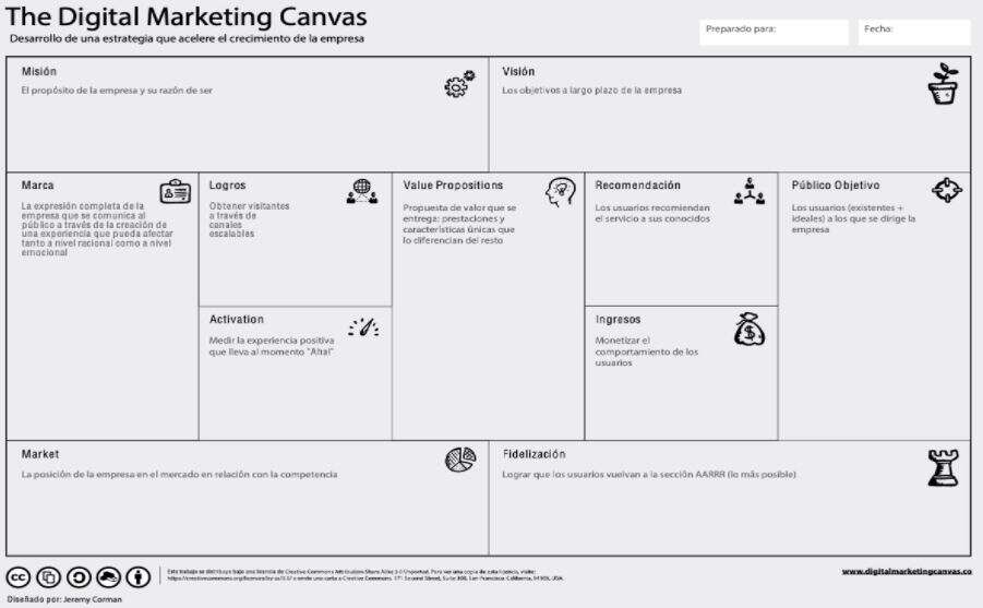 El lienzo de marketing digital elaborado por Dave McClure, proporciona un marco estructurado para comunicar la propuesta de valor de un producto o servicio con tácticas de marketing y tecnologías digitales. Los especialistas en marketing, emprendedores, desarrolladores, diseñadores, gerentes de ventas y éxito del cliente trabajan juntos en el DMC para descubrir estrategias de marketing que se alinean con el ciclo de vida del cliente digital y aceleran el crecimiento empresarial.